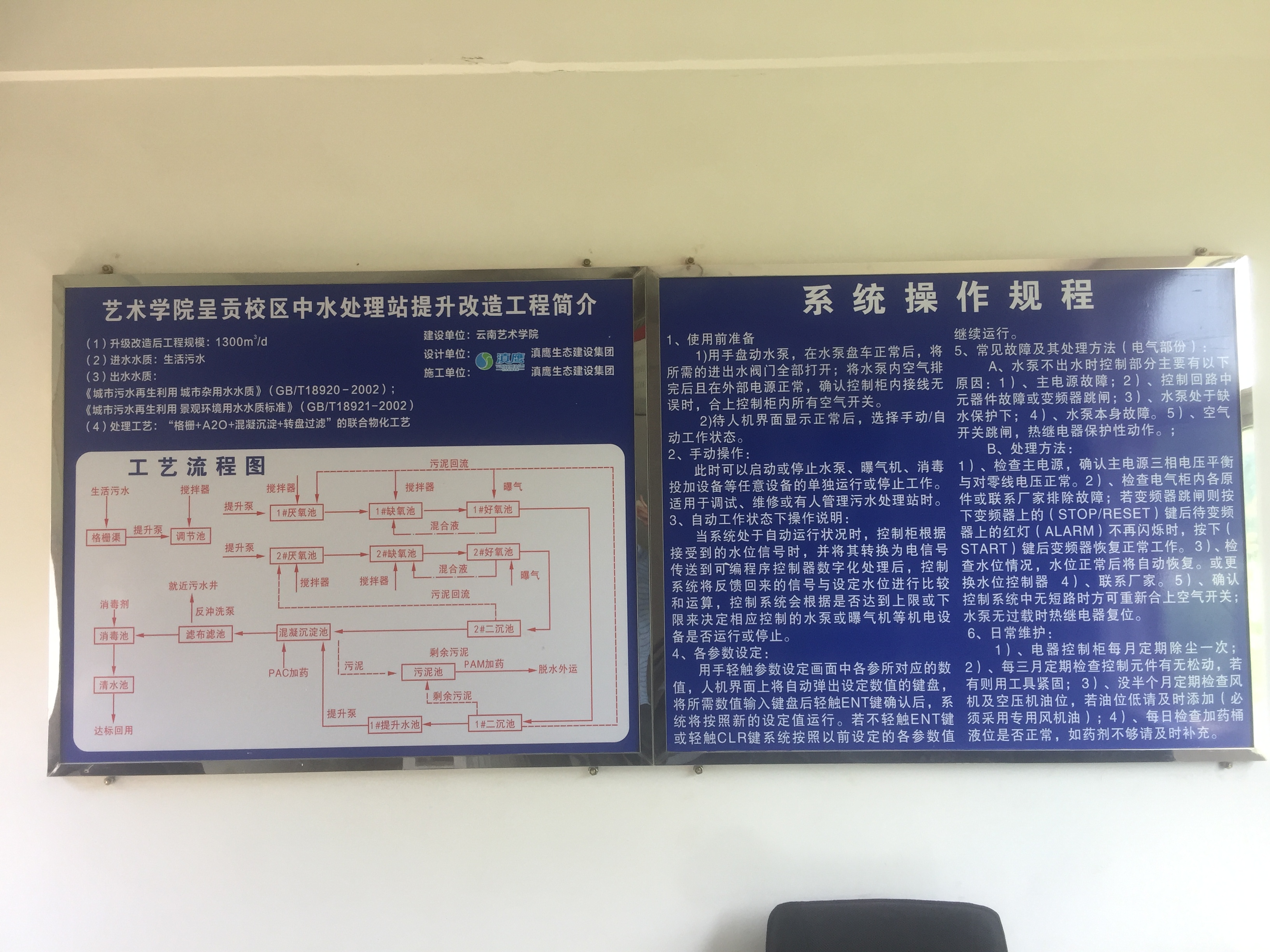 項目負責人向大家介紹了中水處理站的中水處理流程以及實(shí)際運行情況,并同各位領(lǐng)導交流了在與校方溝通過(guò)程中出現的一些問(wèn)題,以便更好的改進(jìn)和優(yōu)化工作流程。 現場(chǎng)安全文明施工規范,張貼有管理制度、系統操作規程等圖示。